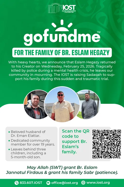 On Wednesday, February 25, 2026, our community suffered a devastating loss. Our brother, Eslam Hegazy, returned to his Creator at the age of 38. Eslam was a remarkably kind, genuine soul and his family were attendees of the Islamic Organization of the Southern Tier (IOST).