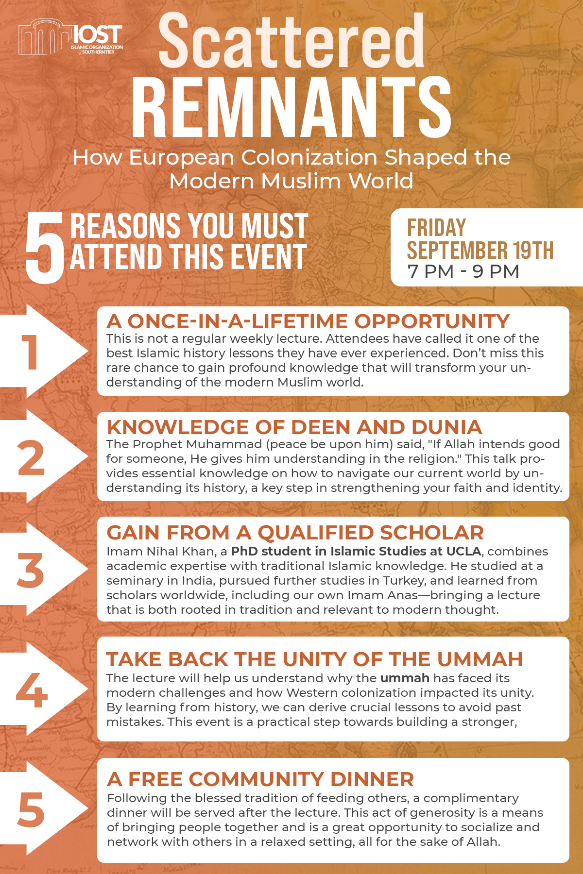 Join us this Friday for an insightful and thought-provoking evening with Imam Nihal Khan, a PhD in Islamic Studies at UCLA, as he presents “Scattered Remnants: How European Colonization Shaped the Modern Muslim World.”