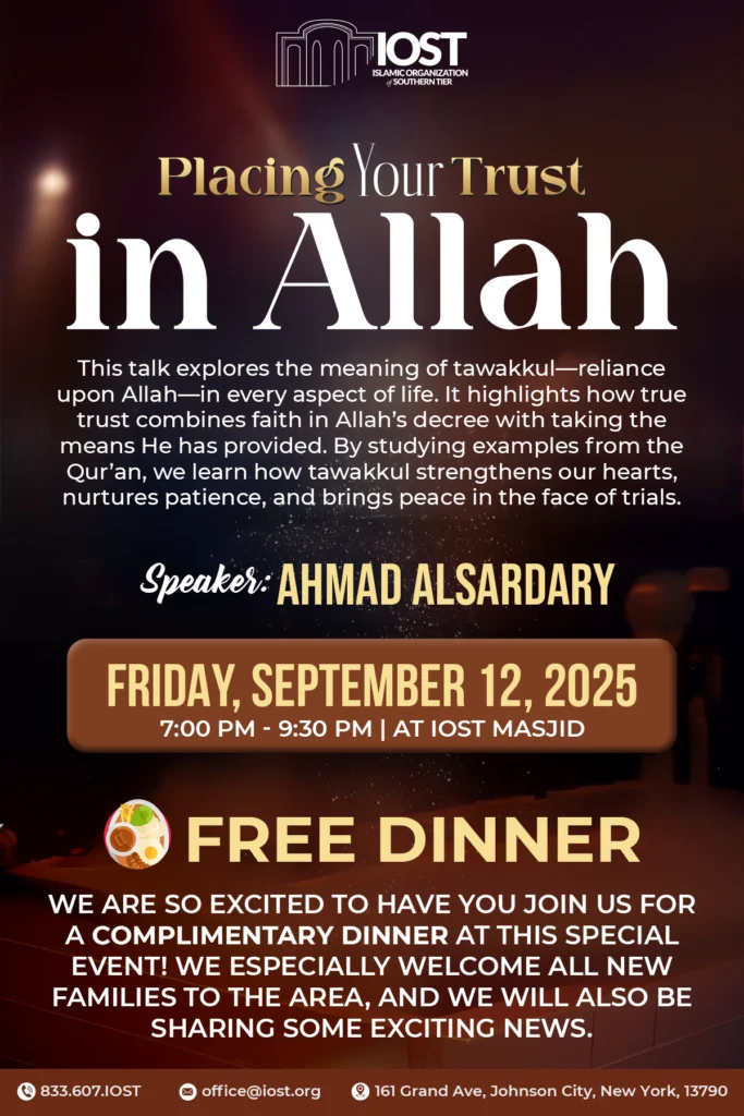 This Friday, join us at IOST for an evening of reflection, inspiration, and community connection. We are honored to host Brother Ahmad Alsardary, who will deliver a special talk titled: “Placing Your Trust in Allah”Tawakkul