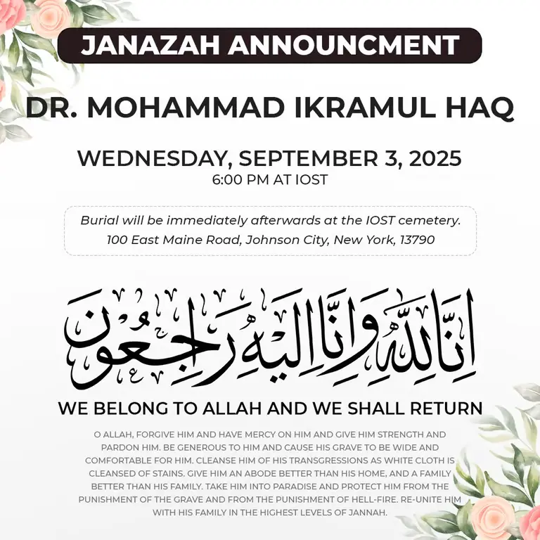 Janazah Today at 6 PM at IOST Inna lillahi wa inna ilayhi raji‘un (“Indeed, to Allah we belong and to Him we shall return.” – Qur’an 2:156) With deep sorrow and submission to the will of Allah ﷻ, we announce the passing of our beloved community member,