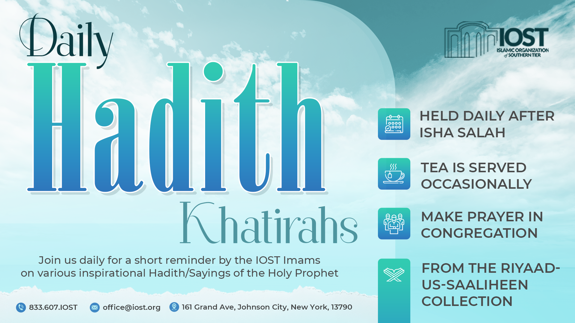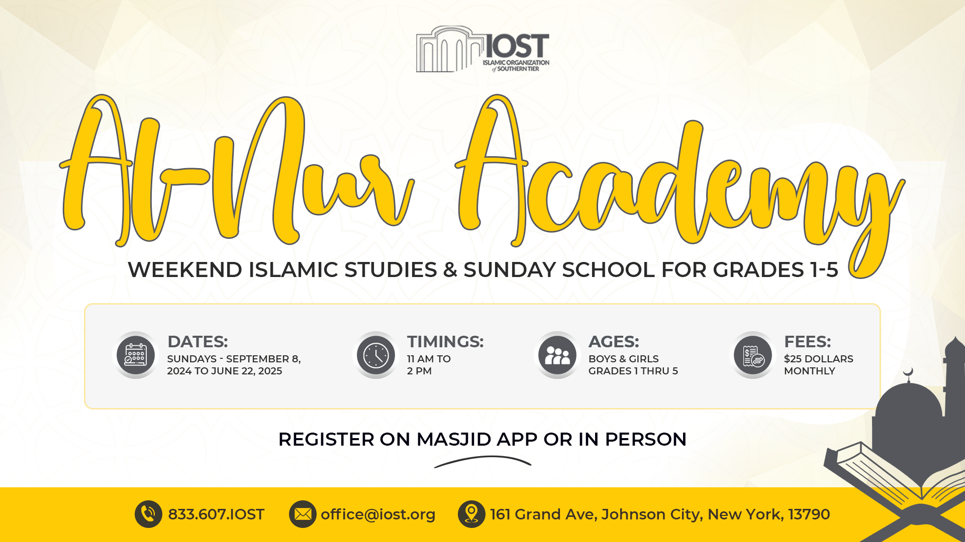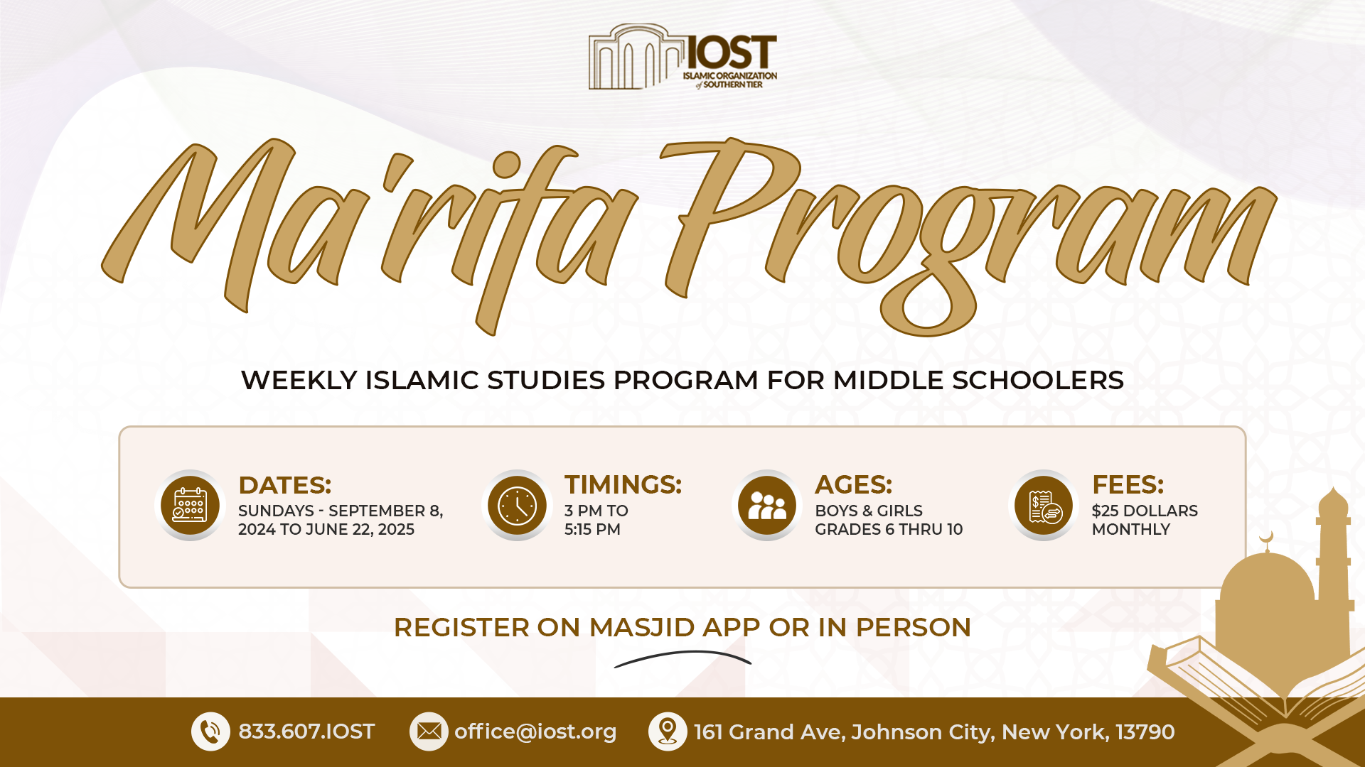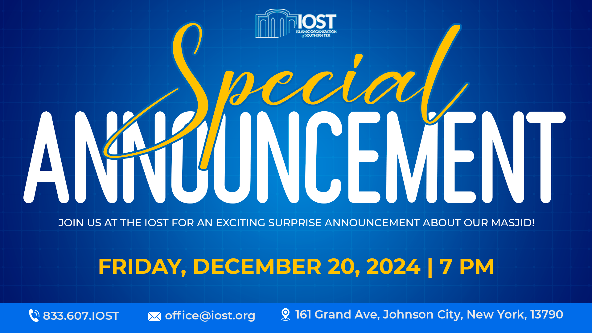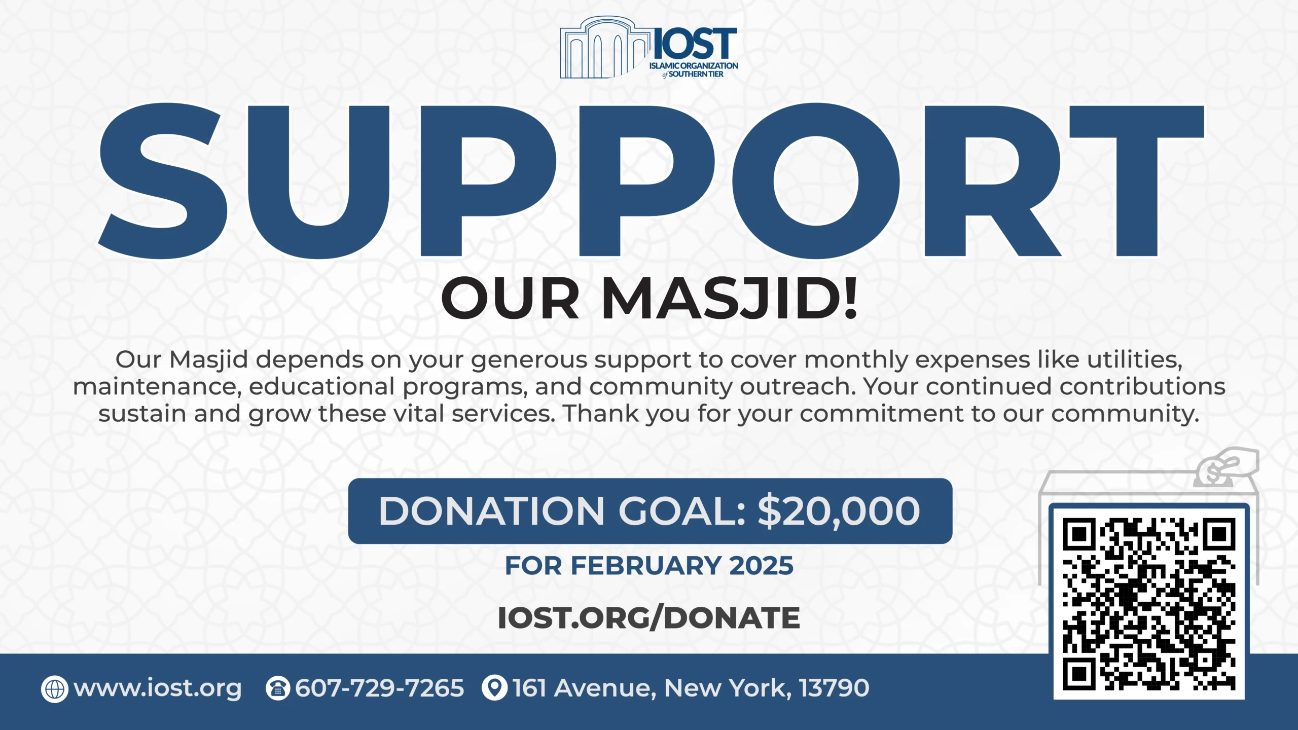 The Islamic Organization of Southern Tier (IOST) is setting forth ambitious goals for 2025, extending beyond our daily services to encompass significant community growth. We are dedicated to achieving four major objectives that will enhance our Masjid’s capabilities and serve the needs of our members more effectively.
