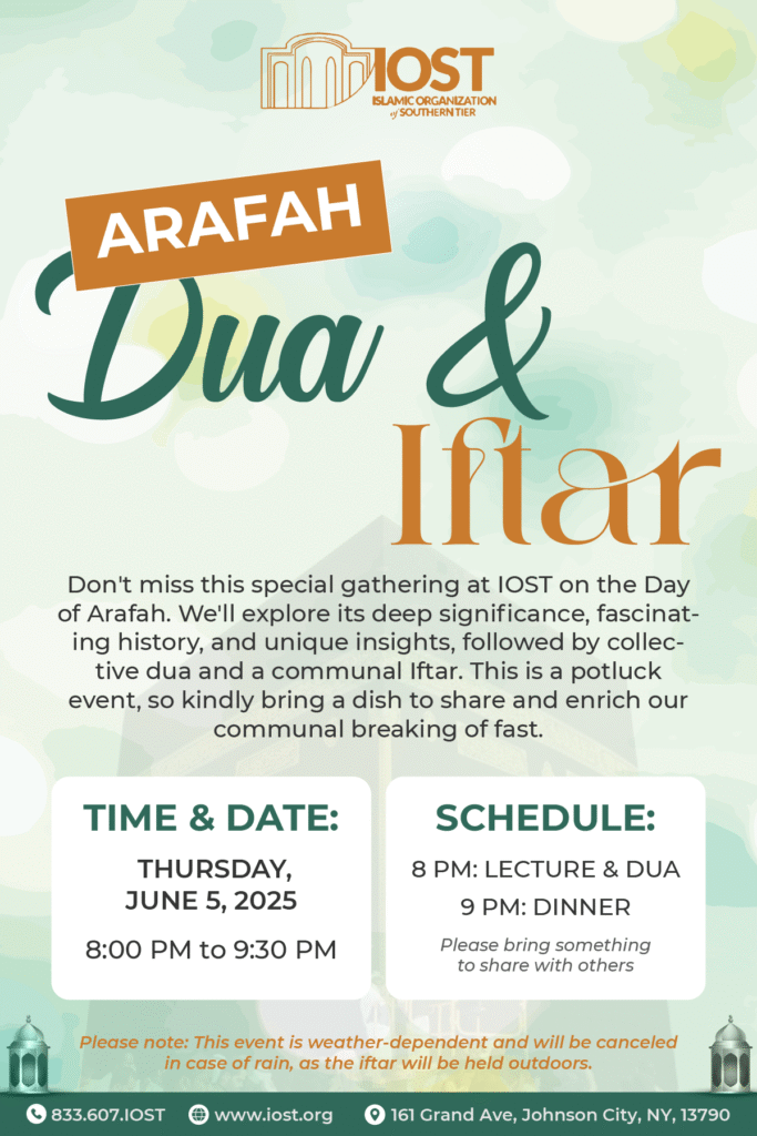 Arafah Dua & Iftar Date: Thursday, June 5, 2025 Time: 8 PM Cost: None Type: Community Iftar Audience: Everyone Food: Potluck Based The Day of Arafah is an incredible opportunity to make heartfelt dua, reflect on our faith, and strengthen our connection with Allah (SWT). Join us at IOST for a special gathering filled with spiritual nourishment and community bonding. 🌟 – A thoughtful lecture exploring the significance and beauty of Arafah. – A collective dua to raise our hands in prayer together. – A communal iftar, where we enjoy a delicious meal and unite in gratitude. 📅 Date: Thursday, June 5, 2025 🕰️ Time: 8:00 PM – 9:30 PM 📍 Location: IOST – 161 Grand Ave, Johnson City, NY 137908:00 PM: Lecture & Collective Dua 🕋 9:00 PM: Communal Iftar (Dinner) 🍽️– This is a potluck gathering – please bring a dish to share 🍲 and contribute to the richness of our community’s meal. – The event is weather-dependent, as we plan to hold the iftar outdoors. In case of rain, the event may be canceled. https://www.youtube.com/watch?v=ww1mZ91j0zw Summary On Friday, January 10, 2025, from 7 PM to 9 PM, the Islamic Organization of the Southern Tier had the privilege of hosting Mufti Aasim Rashid from Detroit for an insightful lecture at our masjid. The program commenced with a beautiful Qur’an recitation by a student from our Hifdh-Ul-Qur’an Academy, setting a reflective atmosphere. Mufti Aasim Rashid then delivered a compelling lecture on the life of Abu Bakr (ra), highlighting his exemplary character and unwavering devotion. The lecture emphasized Abu Bakr’s profound role as both a follower and leader, underscoring his integrity, truthfulness (Siddiq), and selfless sacrifices, particularly his immediate acceptance of Islam, his protection of the Prophet Muhammad (peace be upon him), and his pivotal role during the Hijra. Key lessons included the importance of righteous role models, unwavering faith, and the impact of loyalty and sacrifice. Following the enriching lecture, attendees enjoyed a vibrant potluck dinner, fostering a strong sense of community. Over 70 individuals participated, contributing a diverse array of culinary delights, including various cuisines and pizza. This communal meal provided a wonderful opportunity for fellowship and connection, further strengthening the bonds within the Islamic Organization of the Southern Tier.