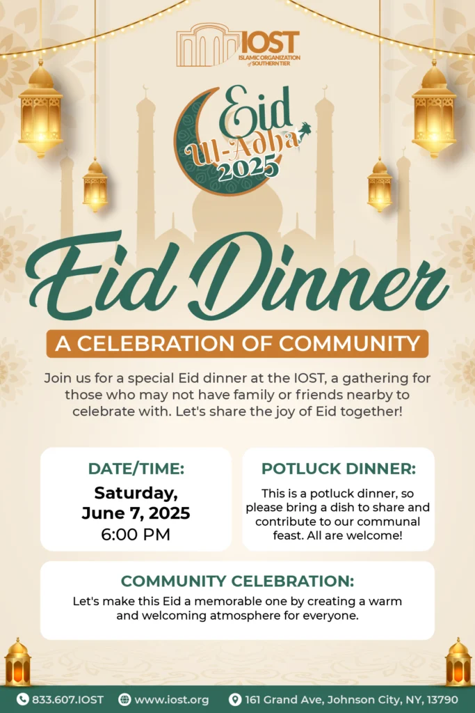 Eid Dinner Date: Saturday, June 7, 2025 Time: 6:00 PM Cost: None Type: Community Iftar Audience: Everyone Food: Potluck Based 🌙 Eid ul-Adha 2025: A Celebration of Community! 🌙 Join us for a heartwarming Eid dinner hosted by IOST that embraces the spirit of togetherness and community! This is a wonderful opportunity to connect with fellow members, share delicious food, and celebrate the joy of Eid. 📅 Date & Time: Saturday, June 7, 2025 | 6:00 PM 🍽️ Potluck Dinner: Bring a dish to share and contribute to our communal feast! This potluck-style dinner encourages everyone to come together, whether you’re bringing a traditional family recipe or trying something new. All contributions are welcome and appreciated! 🤝 Community Celebration: Let’s make this Eid a memorable one by fostering a warm and welcoming atmosphere for all. Whether you’re celebrating with family or making new friends, your presence will add to the joy of this special occasion. 💖 Everyone is Invited! This celebration is an open invitation for everyone in our community! Whether you’re new to the area or just looking for a friendly gathering, we would love for you to join us in this festive celebration. 📍 Location: IOST 161 Grand Ave, Johnson City, NY 13790 📞 For More Information: Feel free to reach out to us at 833.607.IOST or email office@iost.org. Let’s share in the spirit of Eid and create fond memories together! We can’t wait to see you there! 🎉 https://www.youtube.com/watch?v=ww1mZ91j0zw Summary On Friday, January 10, 2025, from 7 PM to 9 PM, the Islamic Organization of the Southern Tier had the privilege of hosting Mufti Aasim Rashid from Detroit for an insightful lecture at our masjid. The program commenced with a beautiful Qur’an recitation by a student from our Hifdh-Ul-Qur’an Academy, setting a reflective atmosphere. Mufti Aasim Rashid then delivered a compelling lecture on the life of Abu Bakr (ra), highlighting his exemplary character and unwavering devotion. The lecture emphasized Abu Bakr’s profound role as both a follower and leader, underscoring his integrity, truthfulness (Siddiq), and selfless sacrifices, particularly his immediate acceptance of Islam, his protection of the Prophet Muhammad (peace be upon him), and his pivotal role during the Hijra. Key lessons included the importance of righteous role models, unwavering faith, and the impact of loyalty and sacrifice. Following the enriching lecture, attendees enjoyed a vibrant potluck dinner, fostering a strong sense of community. Over 70 individuals participated, contributing a diverse array of culinary delights, including various cuisines and pizza. This communal meal provided a wonderful opportunity for fellowship and connection, further strengthening the bonds within the Islamic Organization of the Southern Tier.