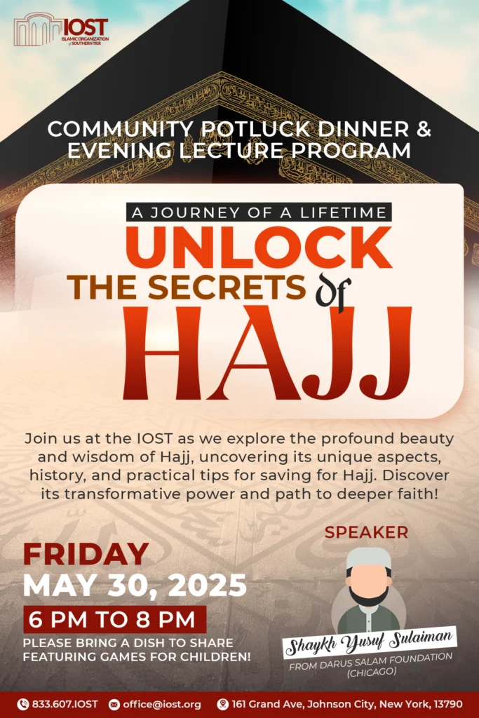 Unlocking the Secrets of Hajj Date: Friday, May 30, 2025 Time: 6 PM to 8 PM Cost: None Type: Potluck Dinner & Evening Lecture Audience: Everyone Food: Bring a dish to share Join the Islamic Organization of the Southern Tier (IOST) for a spiritually enriching Community Potluck Dinner & Evening Lecture Program titled “Unlock the Secrets of Hajj: A Journey of a Lifetime.” This special event invites attendees to delve into the profound beauty, wisdom, and transformative power of Hajj. Learn about its unique aspects, rich history, and practical tips for preparing for this sacred pilgrimage. ✨ Highlights: Enlightening lecture on Hajj and its spiritual significance Potluck dinner (Please bring a dish to share) Fun games and activities for children Everyone is welcome—don’t miss this opportunity to connect with community and deepen your faith! Summary On Friday, January 10, 2025, from 7 PM to 9 PM, the Islamic Organization of the Southern Tier had the privilege of hosting Mufti Aasim Rashid from Detroit for an insightful lecture at our masjid. The program commenced with a beautiful Qur’an recitation by a student from our Hifdh-Ul-Qur’an Academy, setting a reflective atmosphere. Mufti Aasim Rashid then delivered a compelling lecture on the life of Abu Bakr (ra), highlighting his exemplary character and unwavering devotion. The lecture emphasized Abu Bakr’s profound role as both a follower and leader, underscoring his integrity, truthfulness (Siddiq), and selfless sacrifices, particularly his immediate acceptance of Islam, his protection of the Prophet Muhammad (peace be upon him), and his pivotal role during the Hijra. Key lessons included the importance of righteous role models, unwavering faith, and the impact of loyalty and sacrifice. Following the enriching lecture, attendees enjoyed a vibrant potluck dinner, fostering a strong sense of community. Over 70 individuals participated, contributing a diverse array of culinary delights, including various cuisines and pizza. This communal meal provided a wonderful opportunity for fellowship and connection, further strengthening the bonds within the Islamic Organization of the Southern Tier.