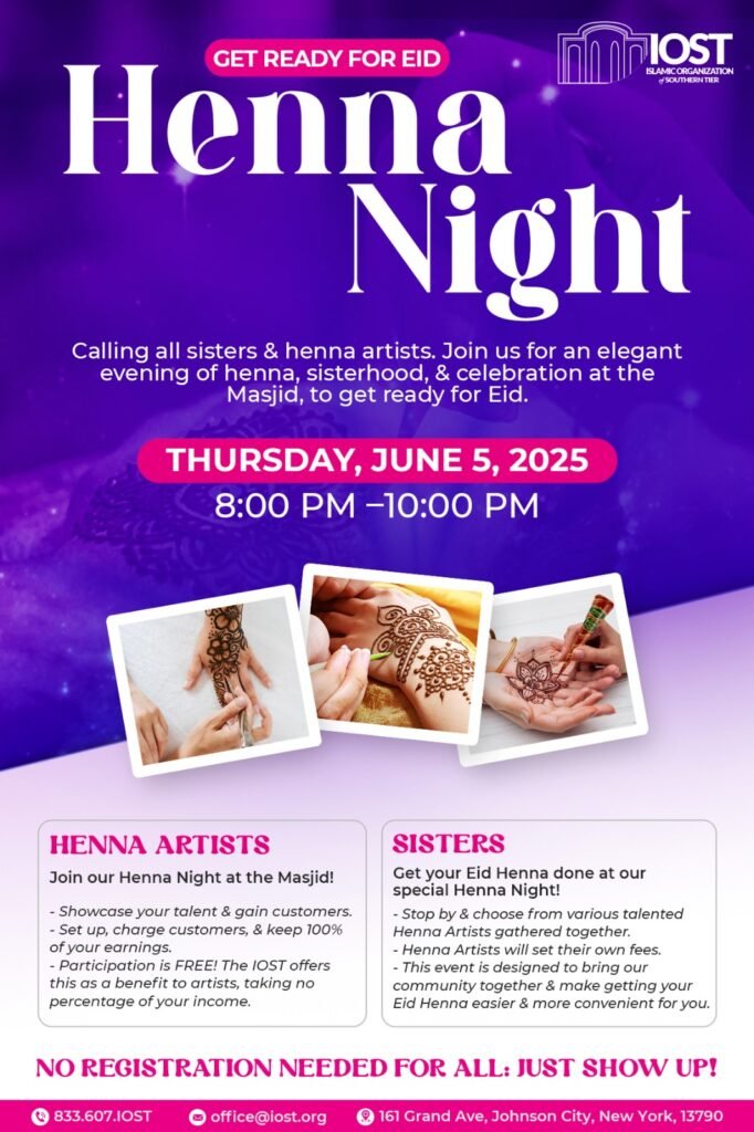 Date: Thursday, June 5, 2025 Time: 8:00 PM Cost: None Type: Henna Night Audience: Everyone Food: Light Refreshments The Day of Arafah is an incredible opportunity to make heartfelt dua, reflect on our faith, and strengthen our connection with Allah (SWT). Join us at IOST for a special gathering filled with spiritual nourishment and community bonding. 🌟 – A thoughtful lecture exploring the significance and beauty of Arafah. – A collective dua to raise our hands in prayer together. – A communal iftar, where we enjoy a delicious meal and unite in gratitude. 📅 Date: Thursday, June 5, 2025 🕰️ Time: 8:00 PM – 9:30 PM 📍 Location: IOST – 161 Grand Ave, Johnson City, NY 137908:00 PM: Lecture & Collective Dua 🕋 9:00 PM: Communal Iftar (Dinner) 🍽️– This is a potluck gathering – please bring a dish to share 🍲 and contribute to the richness of our community’s meal. – The event is weather-dependent, as we plan to hold the iftar outdoors. In case of rain, the event may be canceled. https://www.youtube.com/watch?v=ww1mZ91j0zw Summary On Friday, January 10, 2025, from 7 PM to 9 PM, the Islamic Organization of the Southern Tier had the privilege of hosting Mufti Aasim Rashid from Detroit for an insightful lecture at our masjid. The program commenced with a beautiful Qur’an recitation by a student from our Hifdh-Ul-Qur’an Academy, setting a reflective atmosphere. Mufti Aasim Rashid then delivered a compelling lecture on the life of Abu Bakr (ra), highlighting his exemplary character and unwavering devotion. The lecture emphasized Abu Bakr’s profound role as both a follower and leader, underscoring his integrity, truthfulness (Siddiq), and selfless sacrifices, particularly his immediate acceptance of Islam, his protection of the Prophet Muhammad (peace be upon him), and his pivotal role during the Hijra. Key lessons included the importance of righteous role models, unwavering faith, and the impact of loyalty and sacrifice. Following the enriching lecture, attendees enjoyed a vibrant potluck dinner, fostering a strong sense of community. Over 70 individuals participated, contributing a diverse array of culinary delights, including various cuisines and pizza. This communal meal provided a wonderful opportunity for fellowship and connection, further strengthening the bonds within the Islamic Organization of the Southern Tier.