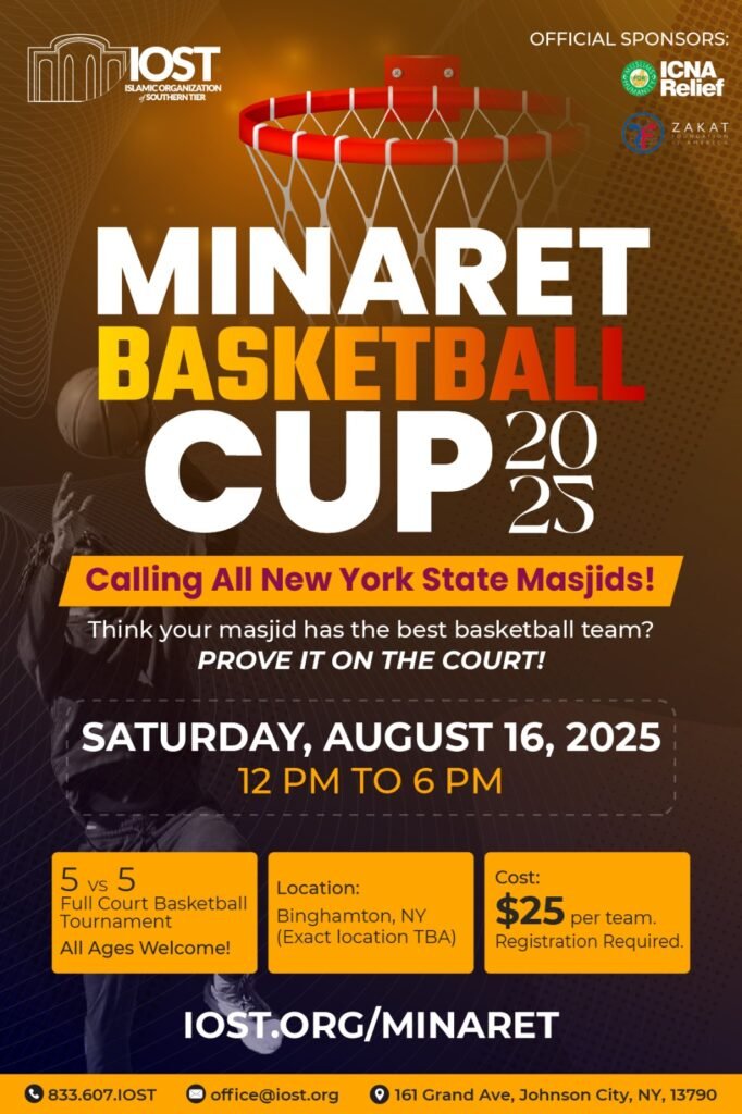 Introducing the first ever Minaret Basketball Cup 2025 Saturday, August 16, 2025 | 12 PM – 8 PM Register Your Team Date Saturday, Aug 16, 2025 12 PM – 8 PM Location Binghamton, NY (Exact Location TBA) Cost $10 Per Player Registration Required Format 5 vs 5 Full Court All Ages Welcome Perks Free Food, Drinks, & Jerseys for all Participants About Minaret Basketball Cup We’re thrilled to announce the first-ever Minaret Basketball Cup in 2025! This exciting initiative brings together Masjid communities across New York State for a tournament centered on camaraderie, sportsmanship, and healthy competition. Exclusively for Muslim teams from NY Masjids and Islamic centers, our goal is to unite communities through the spirit of basketball, promoting teamwork and brotherhood. Join us as we build relationships and trust, strengthening Masjids to become a source of empowerment and change for Muslims. Register Your Team! Ready to compete? The Minaret Cup 2025 challenges Masjid teams to showcase their skills on the court, building brotherhood and unity through spirited basketball rivalry. How It Works Rules & Format Game Length: Two 8-minute running-time halves. Clock Stops: Only during timeouts and the final 2 minutes of the 2nd half. Fouls: Players are disqualified at 5 personal fouls. Timeouts: One timeout per half, per team. Overtime: 5-minute OT, then 3-minute periods until a winner is decided. Islamic Considerations Prayer: Designated breaks will be scheduled for Dhuhr & Asr prayers. Modesty: Modest athletic attire is required. Excessively tight or revealing clothing is discouraged. Values: Taunting, excessive celebration, and disrespect are not tolerated. Prohibitions: No gambling or betting. No profanity or abusive language. Code of Conduct Respect for All: Treat opponents, teammates, officials, and spectators with respect. Fair Play: Play honestly and by the rules. No cheating or intentional harm. Acceptance: Respect all decisions made by referees and organizers. Positive Environment: Contribute to an encouraging and supportive atmosphere. No Aggression: Physical and verbal aggression or intimidation will not be tolerated. Facility Respect: Keep the venue clean and treat it with care. Islamic Etiquette: Uphold Islamic manners and self-control at all times. Violations may result in penalties, disqualification, or team expulsion at the discretion of the organizers. Misc. Info Game Length: Two 8-minute running-time halves. Clock Stops: Only during timeouts and the final 2 minutes of the 2nd half. Fouls: Players are disqualified at 5 personal fouls. Timeouts: One timeout per half, per team. Overtime: 5-minute OT, then 3-minute periods until a winner is decided. Prayer: Designated breaks will be scheduled for Dhuhr & Asr prayers. Modesty: Modest athletic attire is required. Excessively tight or revealing clothing is discouraged. Values: Taunting, excessive celebration, and disrespect are not tolerated. Prohibitions: No gambling or betting. No profanity or abusive language. Respect for All: Treat opponents, teammates, officials, and spectators with respect. Fair Play: Play honestly and by the rules. No cheating or intentional harm. Acceptance: Respect all decisions made by referees and organizers. Positive Environment: Contribute to an encouraging and supportive atmosphere. No Aggression: Physical and verbal aggression or intimidation will not be tolerated. Facility Respect: Keep the venue clean and treat it with care. Islamic Etiquette: Uphold Islamic manners and self-control at all times. Violations may result in penalties, disqualification, or team expulsion at the discretion of the organizers. Sponsor Our Masjid Basketball Tournament! We’re hosting our annual Basketball Tournament at IOST, uniting our community through sport and faith. Your sponsorship is vital to making this event a success and supporting future community initiatives. We are actively seeking generous sponsors to partner with us! Why Partner With Us? Community Engagement: Connect with our vibrant community.High Visibility: Gain exposure to hundreds of attendees and families.Ramadan Fundraising Opportunities: Leverage future fundraising during the blessed month.Direct Interaction (Gold): Engage directly with attendees via a dedicated tabling space.Brand Recognition: Your logo on jerseys, banners, and digital platforms.Online Presence: Featured on our website and social media. Sponsorship Packages Gold Package – $1,500 Primary Logo: On all official tournament jerseys. Dedicated Tabling Space: At the event venue. Top-Tier Logo Placement: On all banners, signage, and promotional materials. Website & Social Media Spotlight: Large logo and link on the homepage, dedicated social mentions. Public Announcements: Recognition during ceremonies and throughout the event. Ramadan Fundraising Priority: Priority for collaborative Ramadan initiatives. Silver Package – $500 Secondary Logo: On official tournament jerseys. Prominent Logo Placement: On banners, signage, and promotional materials. Website & Social Media: Logo and link on the sponsorship page, social mentions. Public Recognition: Acknowledgment during event announcements. Ready to Sponsor? Sponsor Now Ready to Compete? Prove your masjid has the best team on the court! Register Your Team!