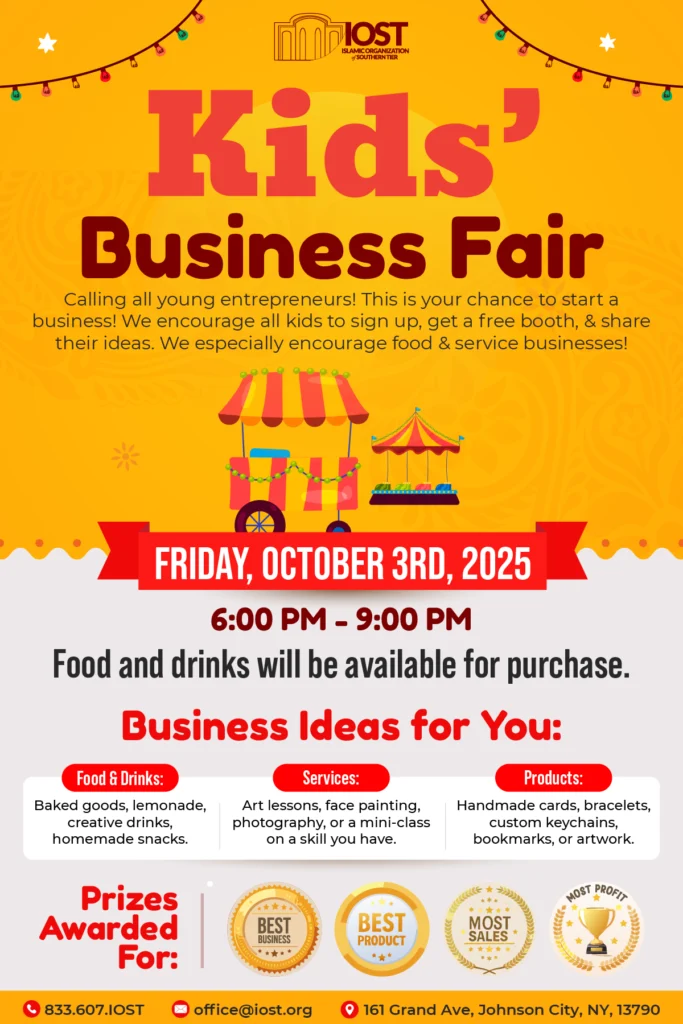 Introducing Kid’s Business Fair The Islamic Organization presents our first annual Kids’ Business Fair, where young entrepreneurs can innovate, create, and sell! Sign Up Your Business! Ready to Register? An unforgettable marketplace where kids become entrepreneurs, building confidence and real-world skills. Register Now Only a few days remain! Join us for a day of inspiration as kids become business owners, showcasing their creativity and hard work. Days Hours Minutes Introducing Kid’s Business Fair The Islamic Organization presents our first annual Kids’ Business Fair, where young entrepreneurs can innovate, create, and sell! Sign Up Your Business! Ready to Register? An unforgettable marketplace where kids become entrepreneurs, building confidence and real-world skills. Register Now Only a few days remain! Join us for a day of inspiration as kids become business owners, showcasing their creativity and hard work. Days Hours Minutes 📅 Date Friday, October 3rd, 2025 ⏰ Time 6:00 PM – 9:00 PM 👥 Attendees ~200 🎪 Booths 30+ available Awards & Prizes Spotlighting young innovators at our first Kids Business Fair. Creativity, sales, and profits earn exciting prizes for tomorrow’s leaders. Best Product Innovation that wows! Most Sales Top earner of the day! Best Business Voted by attendees! Most Profit Highest net earnings! 📍 Event Details 📅 Friday, October 3rd, 2025 🕒 6:00 PM – 9:00 PM 📚 About the Fair By participating, young entrepreneurs will learn how to: Create a Business Plan – Turn ideas into reality. Manage Money – Budget, track expenses, and handle profits. Build Work Ethic – Value dedication and hard work. Practice Marketing – Promote their booth and attract customers. Problem-Solve – Adapt to challenges and think creatively. 🛠 How It Works 1️⃣ Get an Idea: Brainstorm your business idea. 2️⃣ Sign Up: Complete the online form to reserve your free booth. 3️⃣ Get Ready: Work with your family to plan your booth and product. 4️⃣ Set Up & Sell: On the big day, open your booth and start selling! Sign Up Your Business! 👧🧒 Kids’ Info Who we’re looking for: Young entrepreneurs (all ages) to: Start their own mini business Share creative ideas Sell food, services, or handmade products Learn, grow, and have fun! 💡 Business Ideas: Benefits of Being a Vendor: Food & Drinks: Baked goods, lemonade, creative drinks, homemade snacks Services: Art lessons, face painting, photography, or teaching a skill Products: Handmade cards, bracelets, keychains, bookmarks, artwork 🏆 Fair Highlights Five businesses will be awarded. Free booth for all participating kids Food & drinks will be available for purchase Kids’ Business Fair – Hosted by IOST Young Entrepreneurs: Share Your Creativity at the IOST Kids’ Business Fair! Frequently Asked Questions about the Kids’ Business Fair 🛍️ How Does the Fair Work? 🚀 At the Kids’ Business Fair, young entrepreneurs set up their own booths to sell handmade products, creative crafts, or innovative services. Shoppers—our community members—can browse and buy directly from these kid-run businesses. It’s an exciting event where creativity meets commerce, and it’s all about having fun while making sales! 👜 What Should I Bring to the Fair? 🛒 You should bring cash to purchase items from the kids, as they may not have credit card machines. We also encourage you to bring your family and friends to shop, and a positive attitude to support these young business owners. Your enthusiasm and purchases are a huge part of encouraging them! 💵 How Much Does It Cost to Participate? ✨ Great news! It is completely free for all children to have a booth and participate in the fair. We believe in providing this opportunity to every child without any financial barriers. Similarly, there is no cost for anyone to enter and browse the fair. 🌱 What Is the Purpose of This Event? 💡 The purpose of this event is to provide a fun, Islamic-friendly outlet for our children. It’s designed to encourage healthy competition, hard work, and business skills in a safe environment. We aim to inspire a new generation of Muslim entrepreneurs who understand the value of honest work, effort, and serving the community. 👦 How Are the Kids Judged? 🏆 This is a fun competition with prizes awarded for excellence in different areas. We will be recognizing young entrepreneurs for their Best Business, Best Product, the business with the Most Sales, and the one with the Most Profit. The goal is to motivate the children to strive for excellence in their ventures. 👪 Why Is It Important for Parents to Come? 👨👩👧👦 Parents, your role is crucial! Your presence and support mean the world to these young entrepreneurs. By coming to the fair, you are showing them that you value their hard work and creativity. We encourage all parents and family members to attend, browse the booths, and purchase items to help make this a truly successful and unforgettable experience for the kids. At the Kids’ Business Fair, young entrepreneurs set up their own booths to sell handmade products, creative crafts, or innovative services. Shoppers—our community members—can browse and buy directly from these kid-run businesses. It’s an exciting event where creativity meets commerce, and it’s all about having fun while making sales! You should bring cash to purchase items from the kids, as they may not have credit card machines. We also encourage you to bring your family and friends to shop, and a positive attitude to support these young business owners. Your enthusiasm and purchases are a huge part of encouraging them! Great news! It is completely free for all children to have a booth and participate in the fair. We believe in providing this opportunity to every child without any financial barriers. Similarly, there is no cost for anyone to enter and browse the fair. The purpose of this event is to provide a fun, Islam