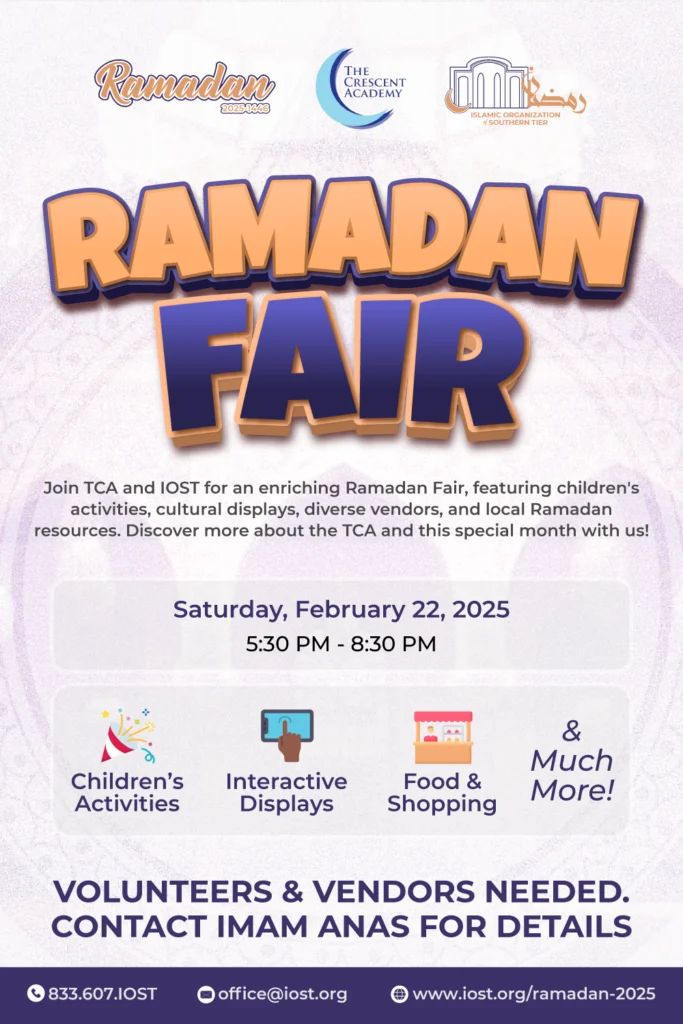Ramadan Fair Ramadan Fair Date: Saturday, February 22, 2025 Time: 5:30 PM to 8:30 PM Cost: None Type: Cuture Night Audience: Everyone Food: Free Kurdish Dinner Provided 🌙✨ 𝐉𝐨𝐢𝐧 𝐔𝐬 𝐟𝐨𝐫 𝐭𝐡𝐞 𝐑𝐚𝐦𝐚𝐝𝐚𝐧 𝐅𝐚𝐢𝐫 ✨🌙 Get ready for an enriching and exciting evening at the 𝐑𝐚𝐦𝐚𝐝𝐚𝐧 𝐅𝐚𝐢𝐫 hosted by The Crescent Academy (TCA) and the Islamic Organization of the Southern Tier (IOST)! There will be games, activities, displays, food, and more. 🗓 Date: Saturday, February 22, 2025⏰ Time: 5:30 PM – 8:30 PM📍 Location: IOST Masjid Come and experience the spirit of Ramadan with:🎉 Children’s Activities – Fun and engaging activities for the little ones!📱 Interactive Displays – Learn, explore, and enjoy!🍴 Food & Shopping – Delicious treats and unique finds from local vendors.🌍 Cultural Displays – Discover the beauty and diversity of Ramadan traditions. This is a wonderful opportunity for the whole family to come together, connect, and celebrate Ramadan. 🌟 𝐕𝐨𝐥𝐮𝐧𝐭𝐞𝐞𝐫𝐬 𝐚𝐧𝐝 𝐕𝐞𝐧𝐝𝐨𝐫𝐬 𝐍𝐞𝐞𝐝𝐞𝐝❗We are in need of vendors to sell Ramadan decorations, supplies, food, and more. If you’d like to participate, contact Imam Anas for more details. Ramadan Details Here:🌐 www.iost.org/ramadan-2025 We can’t wait to see you there! 🕌💕 Summary Join us for an enriching and festive evening at the Ramadan Fair, hosted by The Crescent Academy (TCA) and the Islamic Organization of the Southern Tier (IOST) on Saturday, February 22, 2025, from 5:30 PM to 8:30 PM at IOST Masjid. This family-friendly event will feature exciting children’s activities, interactive displays, cultural showcases, and a vibrant selection of food and shopping from local vendors. A perfect opportunity to embrace the spirit of Ramadan, connect with the community, and celebrate together. Vendors and volunteers are welcome to participate in making this event truly special. Don’t miss out on this wonderful experience—we look forward to seeing you there! 🌙✨