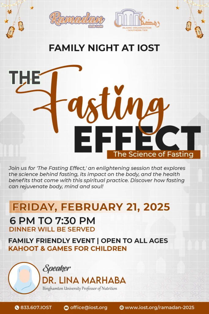 Ramadan Family Night: The Fasting Effect Ramadan Family Night: The Fasting Effect Date: Friday, February 21, 2025 Time: 6 PM Cost: None Type: Cuture Night Audience: Everyone Food: Free Kurdish Dinner Provided 📢 𝗙𝗮𝗺𝗶𝗹𝘆 𝗡𝗶𝗴𝗵𝘁 𝗮𝘁 𝗜𝗢𝗦𝗧: 𝗧𝗵𝗲 𝗙𝗮𝘀𝘁𝗶𝗻𝗴 𝗘𝗳𝗳𝗲𝗰𝘁 – 𝗧𝗵𝗲 𝗦𝗰𝗶𝗲𝗻𝗰𝗲 𝗼𝗳 𝗙𝗮𝘀𝘁𝗶𝗻𝗴 🕌 Join us for an enlightening evening at the Islamic Organization of the Southern Tier (IOST) as we uncover “Fasting Effect: The Science of Fasting” and explore how this spiritual practice benefits the body, mind, and soul! 🌙 🕒 𝗘𝘃𝗲𝗻𝘁 𝗗𝗲𝘁𝗮𝗶𝗹𝘀:📅 Date: Friday, February 21, 2025 ⏰ Time: 6:0 PM – 7:30 PM 📍 Location: Islamic Organization of the Southern Tier (IOST) 🍽 𝗙𝗥𝗘𝗘 𝗖𝗮𝘁𝗲𝗿𝗲𝗱 𝗗𝗶𝗻𝗻𝗲𝗿 𝗳𝗼𝗿 𝗔𝗹𝗹 𝗔𝘁𝘁𝗲𝗻𝗱𝗲𝗲𝘀❗ ✨ 𝗙𝗲𝗮𝘁𝘂𝗿𝗲𝗱 𝗦𝗽𝗲𝗮𝗸𝗲𝗿:We are honored to welcome 𝗗𝗿. 𝗟𝗶𝗻𝗮 𝗠𝗮𝗿𝗵𝗮𝗯𝗮, Professor of Nutrition at Binghamton University, who brings years of extensive research and expertise in the field of nutrition and fasting. Her groundbreaking research and deep understanding of the physiological impacts of fasting make her uniquely qualified to bridge the gap between scientific evidence and spiritual practice. 📚 What’s in Store:– An evidence-based presentation on the scientific benefits of fasting– Insights into cutting-edge research on fasting’s effects on health and wellness– Practical tips for healthy and effective fasting– Interactive Fun for All Ages: Featuring Kahoot trivia challenges and games for children to engage the whole family– Complimentary Dinner: Enjoy a delicious catered meal with our community 🌟 This is a FREE event open to everyone! Whether you’re fasting for spiritual, health, or community reasons, come learn how fasting can revitalize your life. Open to all ages – bring your family and friends! Summary The Islamic Organization of the Southern Tier (IOST) invites the community to a special Family Night event, “The Fasting Effect: The Science of Fasting”. Taking place on Friday, February 21, 2025, from 6 PM to 7:30 PM, this enlightening session will explore the physical, mental, and spiritual benefits of fasting. Renowned nutrition expert, Dr. Lina Marhaba, Professor of Nutrition at Binghamton University, will deliver an evidence-based presentation highlighting the scientific impact of fasting on health and wellness. Attendees will gain valuable insights into cutting-edge research, practical fasting tips, and the connection between faith and science. The evening will also feature engaging Kahoot trivia challenges and interactive games for children, making it a fun learning experience for all ages. As an added treat, a complimentary catered dinner will be provided to all attendees. Open to everyone, this free event offers a wonderful opportunity to deepen understanding of fasting while enjoying quality time with family and friends in a welcoming community setting. Following the enriching lecture, attendees enjoyed a vibrant potluck dinner, fostering a strong sense of community. Over 70 individuals participated, contributing a diverse array of culinary delights, including various cuisines and pizza. This communal meal provided a wonderful opportunity for fellowship and connection, further strengthening the bonds within the Islamic Organization of the Southern Tier.