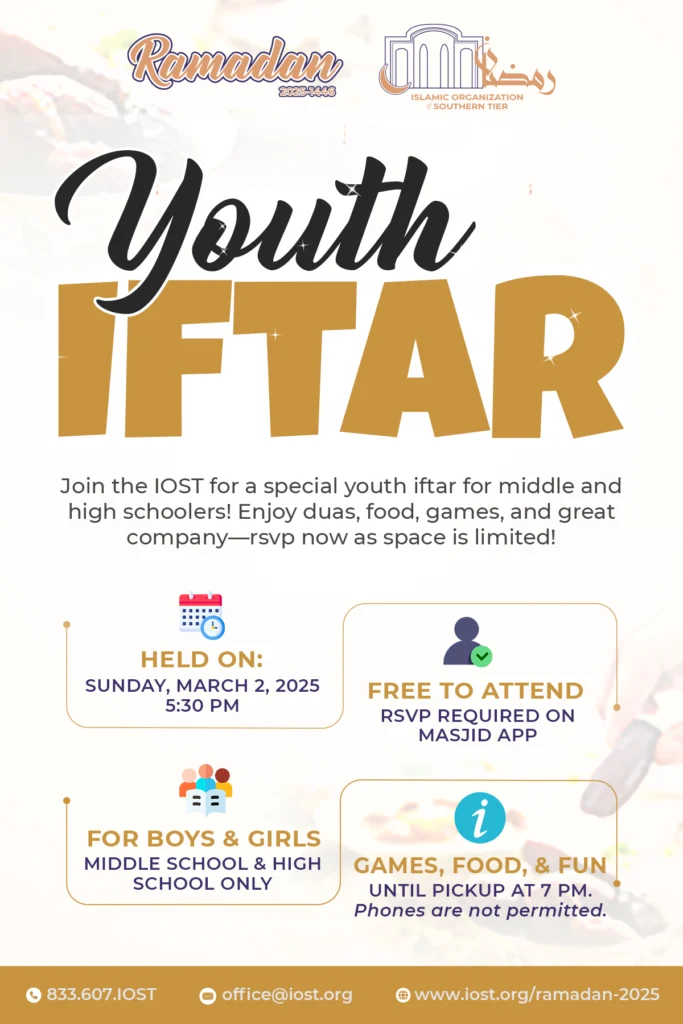 Youth Iftar Date: Friday, January 10, 2025 Time: 7 PM to 9:30 PM Cost: None Type: Family Night Audience: B𝗼𝘆𝘀, G𝗶𝗿𝗹𝘀, M𝗮𝗹𝗲𝘀, 𝗮𝗻𝗱 F𝗲𝗺𝗮𝗹𝗲𝘀 Food: Bring a dish to share Join us for an inspiring evening as we delve into the life and legacy of Abu Bakr (RA), the first Caliph of Islam. This event, part of the “Caliphs & Conquests: Chronicles of Islamic Leadership” series, will explore the remarkable leadership, unwavering faith, and significant contributions of Abu Bakr (RA) during a pivotal period in Islamic history. In this lecture, Mufti Aasim Rashid will illuminate: The pivotal role Abu Bakr (RA) played in the early days of Islam.His exemplary leadership during the Ridda Wars, preserving the unity of the Muslim community.His profound love and dedication to the Prophet Muhammad (peace be upon him).Lessons from his life that remain relevant for Muslims today.This is an opportunity to deepen your understanding of Islamic history, draw inspiration from the lives of our great leaders, and connect with the local Muslim community. Summary On Friday, January 10, 2025, from 7 PM to 9 PM, the Islamic Organization of the Southern Tier had the privilege of hosting Mufti Aasim Rashid from Detroit for an insightful lecture at our masjid. The program commenced with a beautiful Qur’an recitation by a student from our Hifdh-Ul-Qur’an Academy, setting a reflective atmosphere. Mufti Aasim Rashid then delivered a compelling lecture on the life of Abu Bakr (ra), highlighting his exemplary character and unwavering devotion. The lecture emphasized Abu Bakr’s profound role as both a follower and leader, underscoring his integrity, truthfulness (Siddiq), and selfless sacrifices, particularly his immediate acceptance of Islam, his protection of the Prophet Muhammad (peace be upon him), and his pivotal role during the Hijra. Key lessons included the importance of righteous role models, unwavering faith, and the impact of loyalty and sacrifice. Following the enriching lecture, attendees enjoyed a vibrant potluck dinner, fostering a strong sense of community. Over 70 individuals participated, contributing a diverse array of culinary delights, including various cuisines and pizza. This communal meal provided a wonderful opportunity for fellowship and connection, further strengthening the bonds within the Islamic Organization of the Southern Tier.