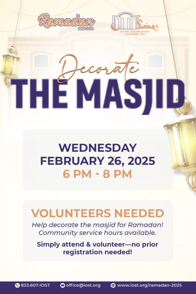 Decorate the Masjid For Ramadan Decorate the Masjid For Ramadan Date: Wednesday, February 26, 2025 Time: 6 PM Cost: None Type: Cuture Night Audience: Everyone Food: Free Kurdish Dinner Provided 📢 𝗛𝗲𝗹𝗽 𝗗𝗲𝗰𝗼𝗿𝗮𝘁𝗲 𝘁𝗵𝗲 𝗠𝗮𝘀𝗷𝗶𝗱 𝗳𝗼𝗿 𝗥𝗮𝗺𝗮𝗱𝗮𝗻❗🌙✨ As the blessed month of Ramadan 2025 (1446 AH) approaches, we’re calling on our youth to lead the way in beautifying our masjid! This is a special opportunity for middle and high school students to take ownership in preparing our spiritual home for this blessed month. 🗓 Date: Wednesday, February 26, 2025 ⏰ Time: 6 PM – 8 PM (After Maghrib Prayers)📍 Location: Islamic Organization of Southern Tier (IOST) Who Should Attend?🎯 Primary Volunteers Needed: High School Students👥 Also Welcome: Adults who wish to assist and supervise Important Check-in Information:⚠️ 𝗠𝗔𝗡𝗗𝗔𝗧𝗢𝗥𝗬: All volunteers must sign in with Imam Anas upon arrival📝 This is required for both students and adults✅ Community service hours will be verified during sign-in What We’ll Be Doing:• Setting up Ramadan decorations• Arranging festive lights• Creating welcoming spaces• Working together as a community Benefits for Students:📚 Earn community service hours🤝 Leadership experience🕌 Contribute to your religious community👥 Meet other Muslim youth No Pre-registration Required!Simply arrive at 6 PM and:1. Sign in with Imam Anas2. Get your assignment3. Join the decorating team! Let’s give our youth the opportunity to shine as they help prepare our masjid for this blessed month! Parents are encouraged to support their children’s participation in this meaningful community service opportunity. 🌙 𝗬𝗼𝘂𝘁𝗵 𝗟𝗲𝗮𝗱𝗶𝗻𝗴 𝘁𝗵𝗲 𝗪𝗮𝘆 – 𝗣𝗿𝗲𝗽𝗮𝗿𝗶𝗻𝗴 𝗢𝘂𝗿 𝗠𝗮𝘀𝗷𝗶𝗱 𝗳𝗼𝗿 𝗥𝗮𝗺𝗮𝗱𝗮𝗻❗ Summary As Ramadan 2025 (1446 AH) approaches, the Islamic Organization of Southern Tier (IOST) is inviting high school students to take the lead in decorating the masjid for this blessed month. This initiative provides young volunteers with a chance to contribute to their religious community while gaining leadership experience and earning community service hours. Adults are also welcome to assist and supervise. The event will take place on Wednesday, February 26, 2025, from 6 PM to 8 PM, following Maghrib prayers, at IOST. Volunteers will help set up Ramadan decorations, arrange festive lights, and create welcoming spaces to enhance the masjid’s atmosphere. All participants must sign in with Imam Anas upon arrival, as sign-in is mandatory for both students and adults and required for verifying community service hours. No pre-registration is needed—volunteers can simply arrive at 6 PM, sign in, receive their assignment, and join the decorating efforts. Parents are encouraged to support their children in this meaningful opportunity to prepare the masjid for Ramadan while fostering a sense of community and unity among Muslim youth. Following the enriching lecture, attendees enjoyed a vibrant potluck dinner, fostering a strong sense of community. Over 70 individuals participated, contributing a diverse array of culinary delights, including various cuisines and pizza. This communal meal provided a wonderful opportunity for fellowship and connection, further strengthening the bonds within the Islamic Organization of the Southern Tier.