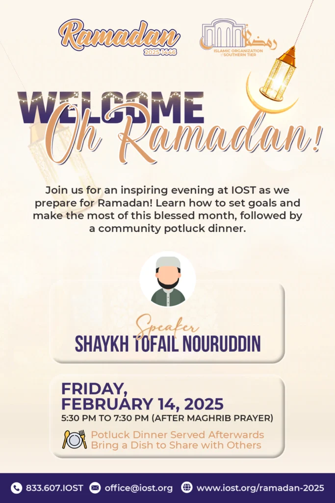 Welcome Oh Ramadan – Potluck Dinner Program Welcome Oh Ramadan – Potluck Dinner Program Date: Friday, February 14, 2025 Time: 5:30 PM to 7:30 PM Cost: None Type: Cuture Night Audience: Everyone Food: Free Kurdish Dinner Provided 🌙 𝗪𝗲𝗹𝗰𝗼𝗺𝗲 𝗢𝗵 𝗥𝗮𝗺𝗮𝗱𝗮𝗻❗ 🌙 Join us for a evening at IOST as we prepare to embrace the holy month of Ramadan! We invite everyone in our community to come together for an evening filled with inspiration, connection, and food! 🗓️ Date: Friday, February 14, 2025🕒 Time: 5:30 PM to 7:30 PM (after Maghrib prayer – NOT After Isha Prayers)📍 Location: Islamic Organization of Southern Tier (IOST) Our special guest speaker, Shaykh Tofail Nouruddin, will guide us through a session on how to set meaningful goals for this blessed month. Whether you’re hoping to strengthen your faith, improve your prayers, or enhance your acts of kindness, Shaykh Tofail’s insights will help you get ready to make the most out of Ramadan. 🍽️ 𝗣𝗼𝘁𝗹𝘂𝗰𝗸 𝗗𝗶𝗻𝗻𝗲𝗿: After the talk, enjoy a community potluck dinner! Bring your favorite dish to share with others. This is a perfect opportunity to bond over food and fellowship! 🎉 𝗙𝘂𝗻 𝗳𝗼𝗿 𝗞𝗶𝗱𝘀: We believe family time is essential, which is why we have organized games and fun activities for the little ones! 🎈🎲 They’ll have a great time while you connect with fellow community members. This event is a opportunity to re-center on your spiritual goals and share the joy of Ramadan with your loved ones. Don’t miss out on this evening of connection, reflection, and community spirit! Summary Join us on Friday, February 14, 2025, from 5:30 PM to 7:30 PM at IOST for Welcome Oh Ramadan!—an evening dedicated to preparing for the holy month with inspiration, connection, and community bonding. Special guest Shaykh Tofail Nouruddin will lead a session on setting meaningful Ramadan goals, offering insights on strengthening faith, improving prayers, and enhancing acts of kindness. After the talk, attendees can enjoy a community potluck dinner, bringing their favorite dish to share. Families are encouraged to participate, with games and fun activities for children ensuring an engaging experience for all. This gathering is a perfect opportunity to reflect, reconnect, and embrace the spirit of Ramadan together. Don’t miss this uplifting event! 🌙✨