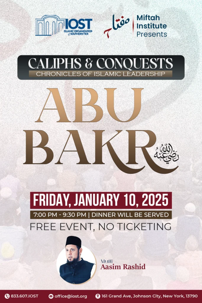 Caliphs & Conquests: Chronicles of Islamic Leadership Date: Friday, January 10, 2025 Time: 7 PM to 9:30 PM Cost: None Type: Family Night Audience: B𝗼𝘆𝘀, G𝗶𝗿𝗹𝘀, M𝗮𝗹𝗲𝘀, 𝗮𝗻𝗱 F𝗲𝗺𝗮𝗹𝗲𝘀 Food: Bring a dish to share Join us for an inspiring evening as we delve into the life and legacy of Abu Bakr (RA), the first Caliph of Islam. This event, part of the “Caliphs & Conquests: Chronicles of Islamic Leadership” series, will explore the remarkable leadership, unwavering faith, and significant contributions of Abu Bakr (RA) during a pivotal period in Islamic history. In this lecture, Mufti Aasim Rashid will illuminate: The pivotal role Abu Bakr (RA) played in the early days of Islam.His exemplary leadership during the Ridda Wars, preserving the unity of the Muslim community.His profound love and dedication to the Prophet Muhammad (peace be upon him).Lessons from his life that remain relevant for Muslims today.This is an opportunity to deepen your understanding of Islamic history, draw inspiration from the lives of our great leaders, and connect with the local Muslim community. https://www.youtube.com/watch?v=ww1mZ91j0zw Summary On Friday, January 10, 2025, from 7 PM to 9 PM, the Islamic Organization of the Southern Tier had the privilege of hosting Mufti Aasim Rashid from Detroit for an insightful lecture at our masjid. The program commenced with a beautiful Qur’an recitation by a student from our Hifdh-Ul-Qur’an Academy, setting a reflective atmosphere. Mufti Aasim Rashid then delivered a compelling lecture on the life of Abu Bakr (ra), highlighting his exemplary character and unwavering devotion. The lecture emphasized Abu Bakr’s profound role as both a follower and leader, underscoring his integrity, truthfulness (Siddiq), and selfless sacrifices, particularly his immediate acceptance of Islam, his protection of the Prophet Muhammad (peace be upon him), and his pivotal role during the Hijra. Key lessons included the importance of righteous role models, unwavering faith, and the impact of loyalty and sacrifice. Following the enriching lecture, attendees enjoyed a vibrant potluck dinner, fostering a strong sense of community. Over 70 individuals participated, contributing a diverse array of culinary delights, including various cuisines and pizza. This communal meal provided a wonderful opportunity for fellowship and connection, further strengthening the bonds within the Islamic Organization of the Southern Tier.