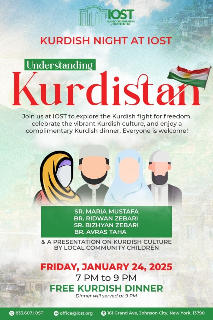 Understanding Kurdistan: Kurdish Night at IOST Date: Friday, January 24, 2025 Time: 7 PM to 9 PM Cost: None Type: Cuture Night Audience: Everyone Food: Free Kurdish Dinner Provided Introducing Kurdish Night at IOST 📖 Join us on Friday, January 24, 2025, from 7 PM to 9 PM, for Kurdish Night at IOST. Learn about the Kurdish fight for freedom. We will go over the vibrant Kurdish culture, and the history of Kurdish people in our community! Presenters:Sister Maria MustafaSister Bizhyan ZebariBrother Avras TahaBrother Ridwan ZebariFew Children will also showcase and present about the culture! Everyone is welcome to join. A Kurdish dinner will be served at 9 PM after the presentations & discussions. Bring your family and friends to participate in this event. We looking forward to seeing you there! Summary On Friday, January 24, 2025, the IOST hosted a special “Kurdish Night,” dedicated to exploring the rich culture, history, and struggle for freedom of the Kurdish people. The event featured engaging presentations, including Sister Maria Mustafa’s insights into the origins of the Kurdish people, and Brother Ridwan Zebari’s discussion of famous Kurdish figures such as Salahuddin Ayubi. Sister Bizhyan Zebari and Brother Avras Taha also contributed valuable perspectives, alongside insightful showcases from children within the community. Attendees gained a deeper understanding of Kurdish heritage and its impact on society. The evening was a resounding success, drawing over 250 attendees who joined in celebration and learning. Following the discussions, a delicious Kurdish dinner was served, with over 50 dishes brought by the generous Kurdish community, fostering a warm and welcoming atmosphere for continued conversation. The event provided a meaningful experience for families and friends to celebrate and learn together.