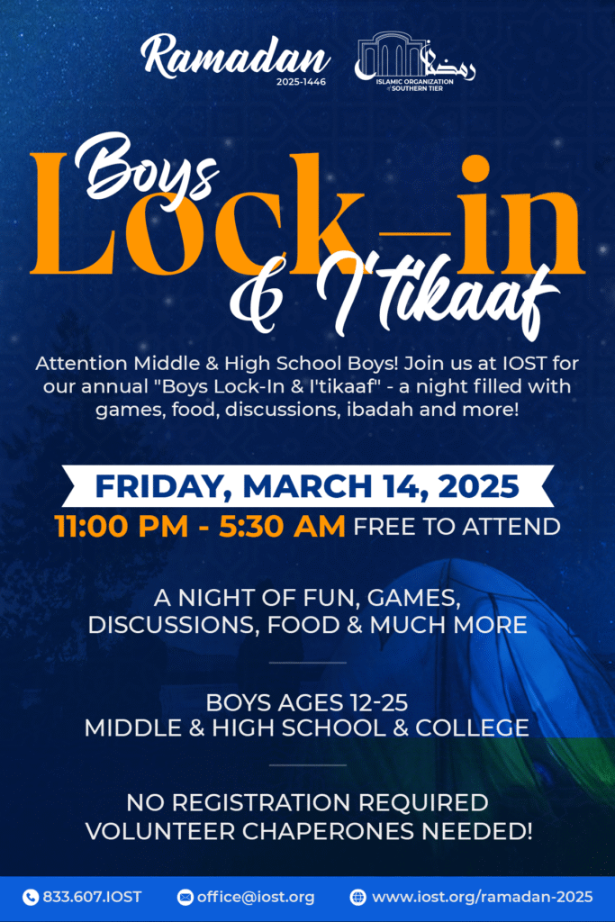 Boys Qiyam Date: Friday, January 10, 2025 Time: 7 PM to 9:30 PM Cost: None Type: Family Night Audience: B𝗼𝘆𝘀, G𝗶𝗿𝗹𝘀, M𝗮𝗹𝗲𝘀, 𝗮𝗻𝗱 F𝗲𝗺𝗮𝗹𝗲𝘀 Food: Bring a dish to share Join us for an inspiring evening as we delve into the life and legacy of Abu Bakr (RA), the first Caliph of Islam. This event, part of the “Caliphs & Conquests: Chronicles of Islamic Leadership” series, will explore the remarkable leadership, unwavering faith, and significant contributions of Abu Bakr (RA) during a pivotal period in Islamic history. In this lecture, Mufti Aasim Rashid will illuminate: The pivotal role Abu Bakr (RA) played in the early days of Islam. His exemplary leadership during the Ridda Wars, preserving the unity of the Muslim community. His profound love and dedication to the Prophet Muhammad (peace be upon him). Lessons from his life that remain relevant for Muslims today. This is an opportunity to deepen your understanding of Islamic history, draw inspiration from the lives of our great leaders, and connect with the local Muslim community. Summary On Friday, January 10, 2025, from 7 PM to 9 PM, the Islamic Organization of the Southern Tier had the privilege of hosting Mufti Aasim Rashid from Detroit for an insightful lecture at our masjid. The program commenced with a beautiful Qur’an recitation by a student from our Hifdh-Ul-Qur’an Academy, setting a reflective atmosphere. Mufti Aasim Rashid then delivered a compelling lecture on the life of Abu Bakr (ra), highlighting his exemplary character and unwavering devotion. The lecture emphasized Abu Bakr’s profound role as both a follower and leader, underscoring his integrity, truthfulness (Siddiq), and selfless sacrifices, particularly his immediate acceptance of Islam, his protection of the Prophet Muhammad (peace be upon him), and his pivotal role during the Hijra. Key lessons included the importance of righteous role models, unwavering faith, and the impact of loyalty and sacrifice. Following the enriching lecture, attendees enjoyed a vibrant potluck dinner, fostering a strong sense of community. Over 70 individuals participated, contributing a diverse array of culinary delights, including various cuisines and pizza. This communal meal provided a wonderful opportunity for fellowship and connection, further strengthening the bonds within the Islamic Organization of the Southern Tier.