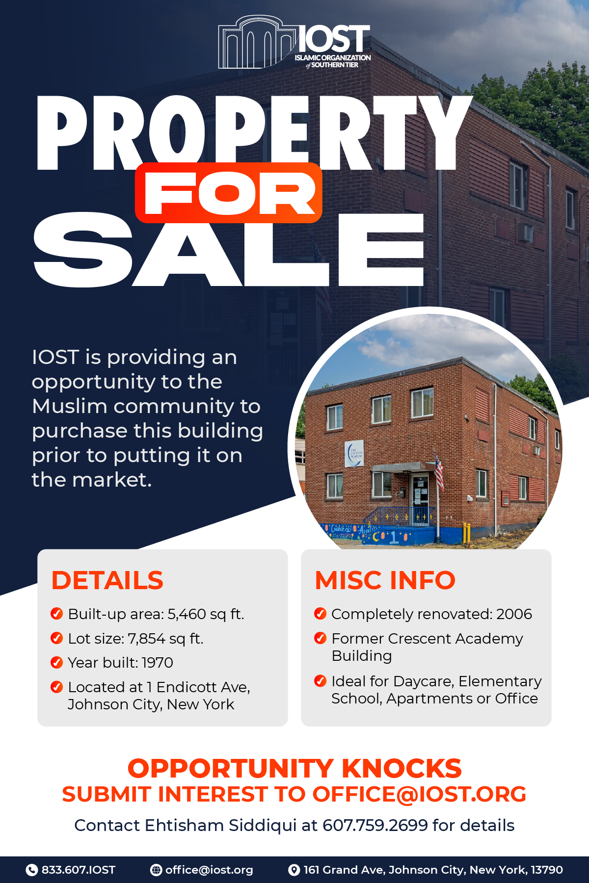 The Islamic Organization of the Southern Tier (IOST) is offering the Muslim community an exclusive opportunity to purchase the Former Crescent Academy Building located adjacent to the Masjid, prior to listing it on the general market.