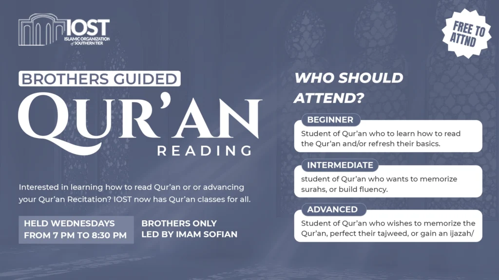 The Brothers Guided Reading Halaqah is open to all adults, providing an opportunity to learn how to read the Qur’an or improve their recitation skills, ranging from beginners to advanced learners.
