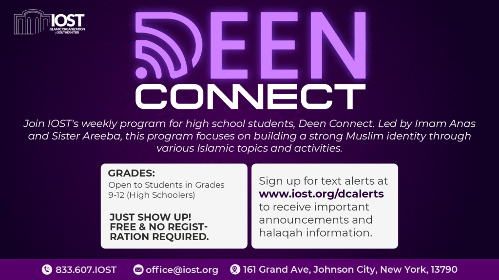 Deen Connect is IOST’s Sunday program for high school students in grades 9 through 12. Join us from 4:30 PM to 6:00 PM for insightful discussions and fellowship.