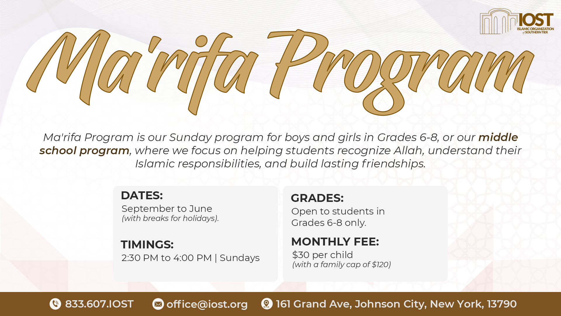 The Ma’rifa Program is IOST’s weekly Sunday school initiative for middle school students in grades 6 through 8. Classes are held from 2:30 PM to 4:00 PM.