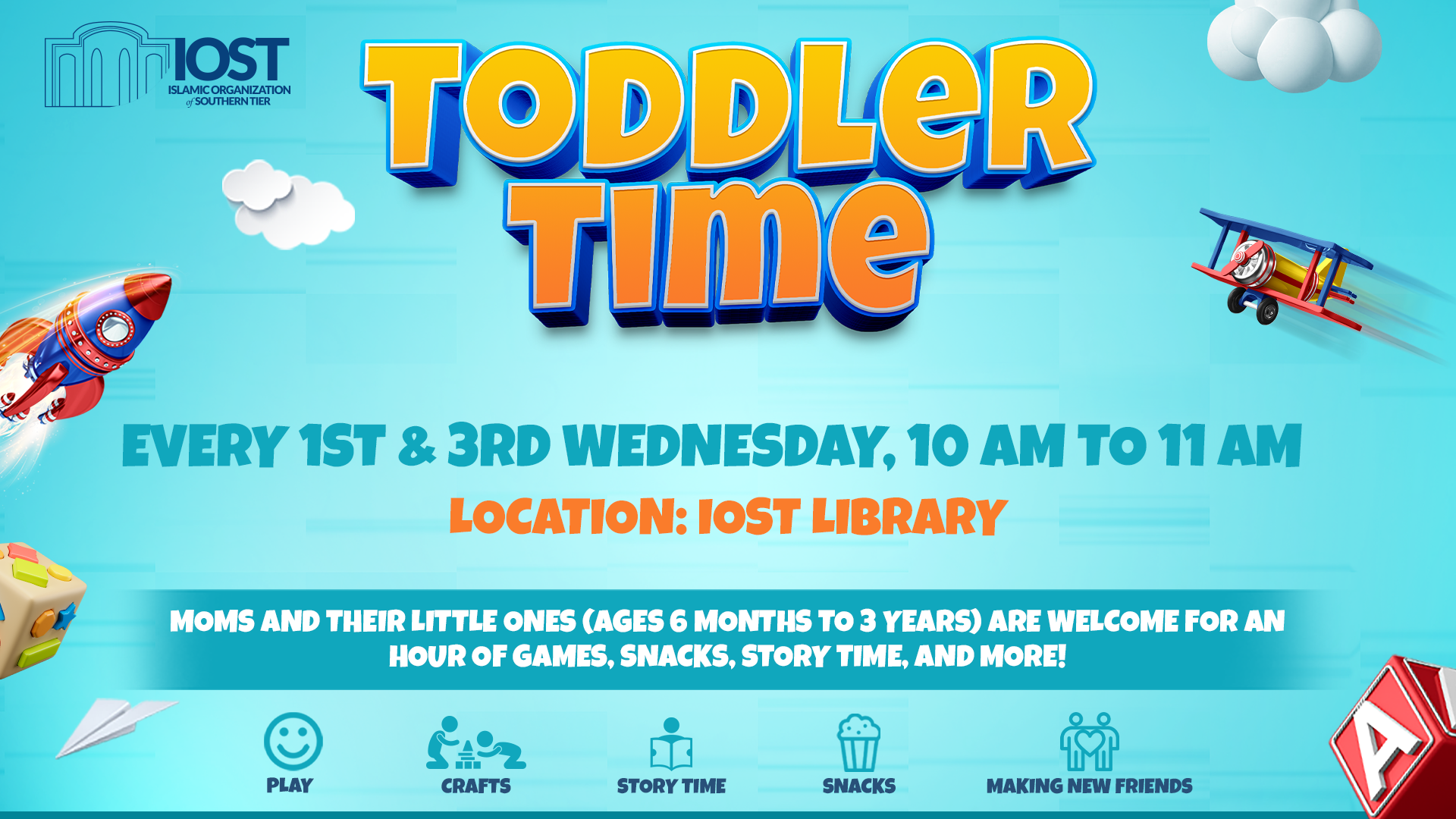 IOST’s bi-weekly Toddler Time offers mothers and toddlers (6 months – 3 years) Islamic-based activities like games, crafts, snacks, and story time for fun and learning.