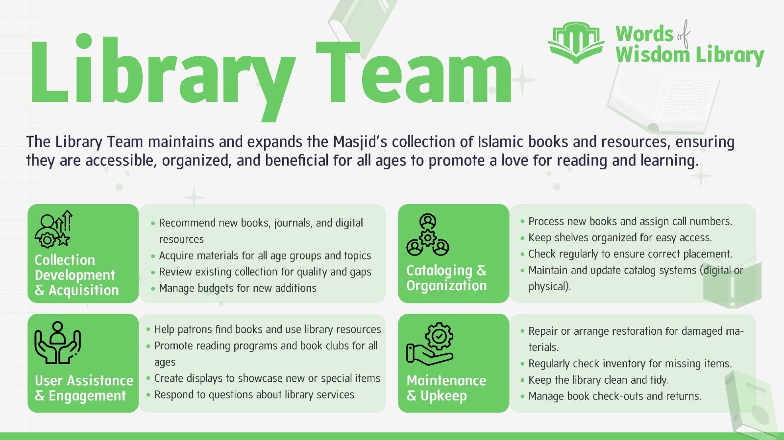 The Library Team maintains and expands the Masjid’s collection of Islamic books and resources, ensuring